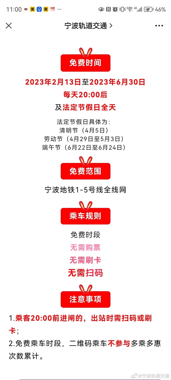 据宁波轨道交通官微,宁波轨道交通2月13日起,推出免费乘车新举措。